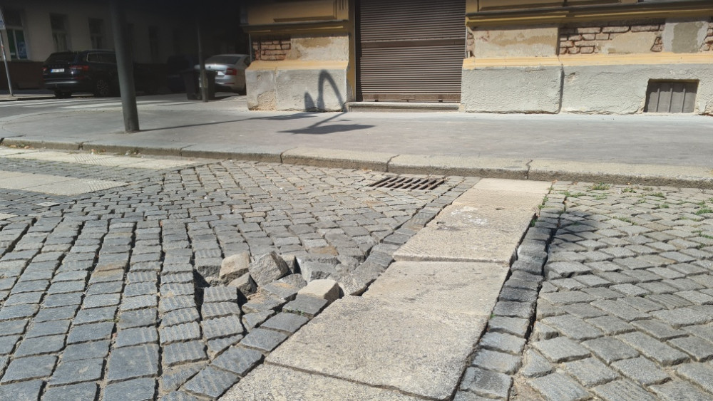 Rozjopaná díra na silnici s vyčuhujícími kostkami