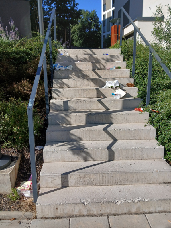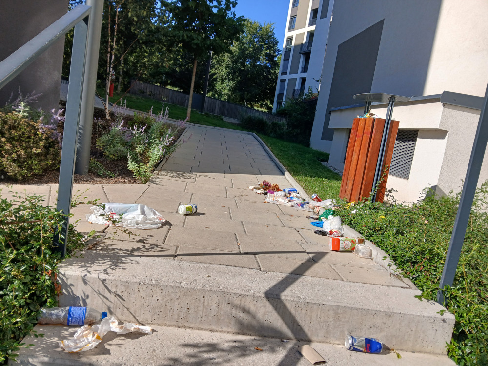 Rozházené odpadky okolo koše u zastávky Olgy Havlové směr na basilejske nam.