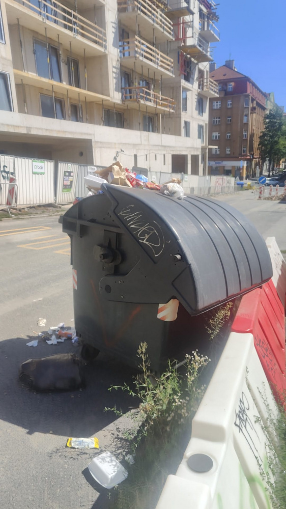 V ulici Pražačka u vjezdu do parku Vítkov, je cizí neoznačený přeplněný kontejner, který tam nemá co dělat.