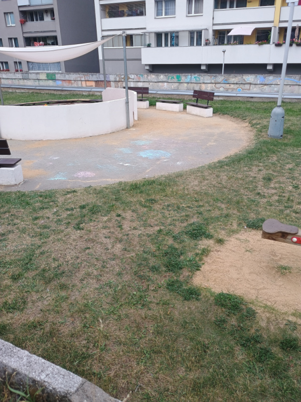 Nepořádek na hřišti mezi paneláky v ul. Žerotínova. Odpadky, vajgly, zbytky jídla po celé ploše, rozbité hračky. Prosím o úklid.