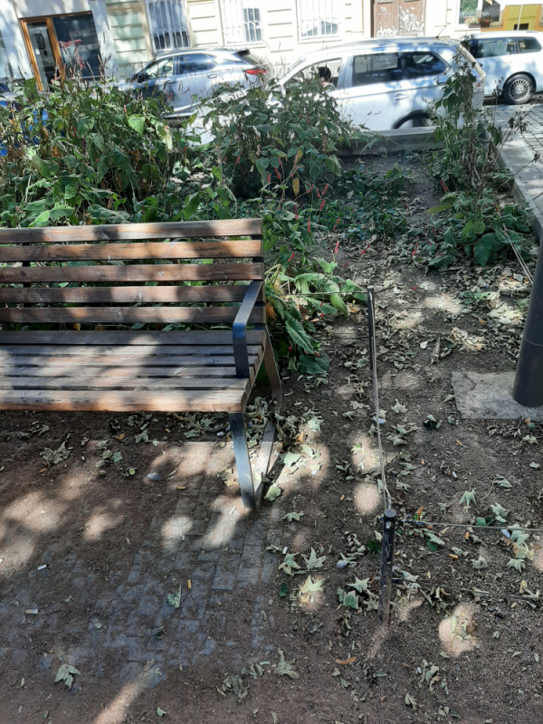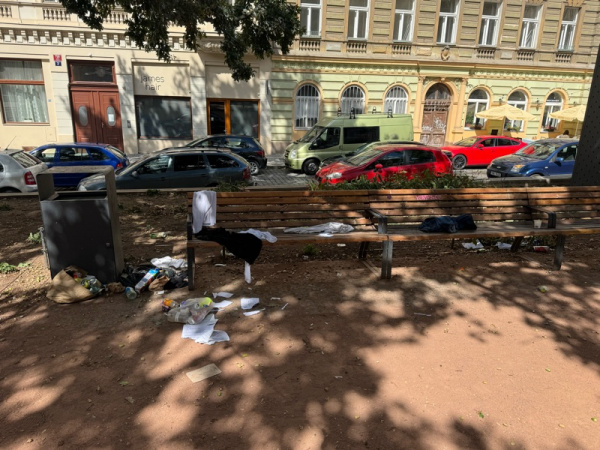 Nepořádek na lavičkách v parku na Kostnickém náměstí