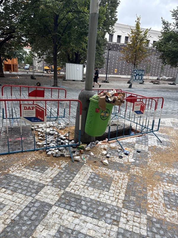 na náměstí probíhají stavební práce a koš byl nejspíše za oplocením, které se postupně odhaluje. O problému budeme informovat TSK.