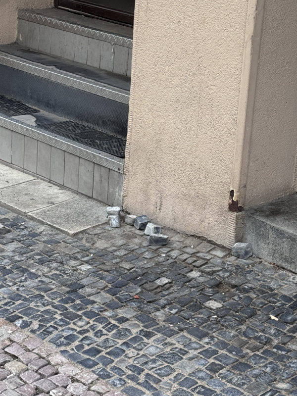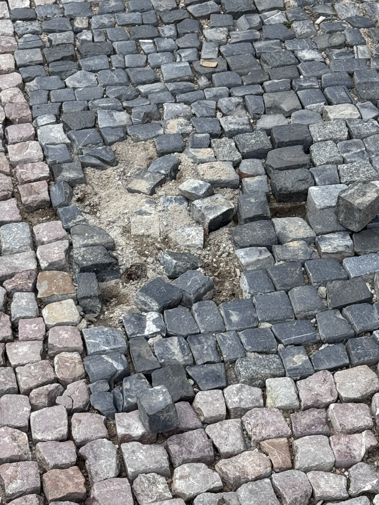 Kostky rozházené všude po ulici, díra v chodníku lidé tu zakopávají.