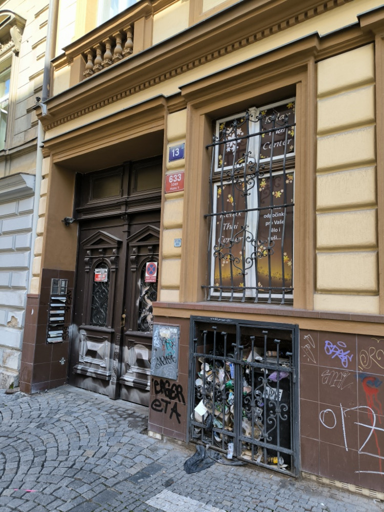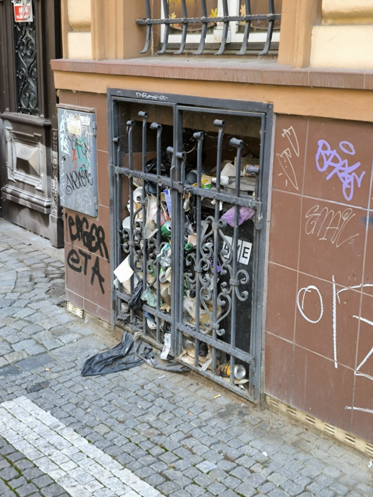 Odpad hromadící se v prostoru pro popelnice ve zdi domu, které již začínají zapáchat a vypadávat ven na ulici.
