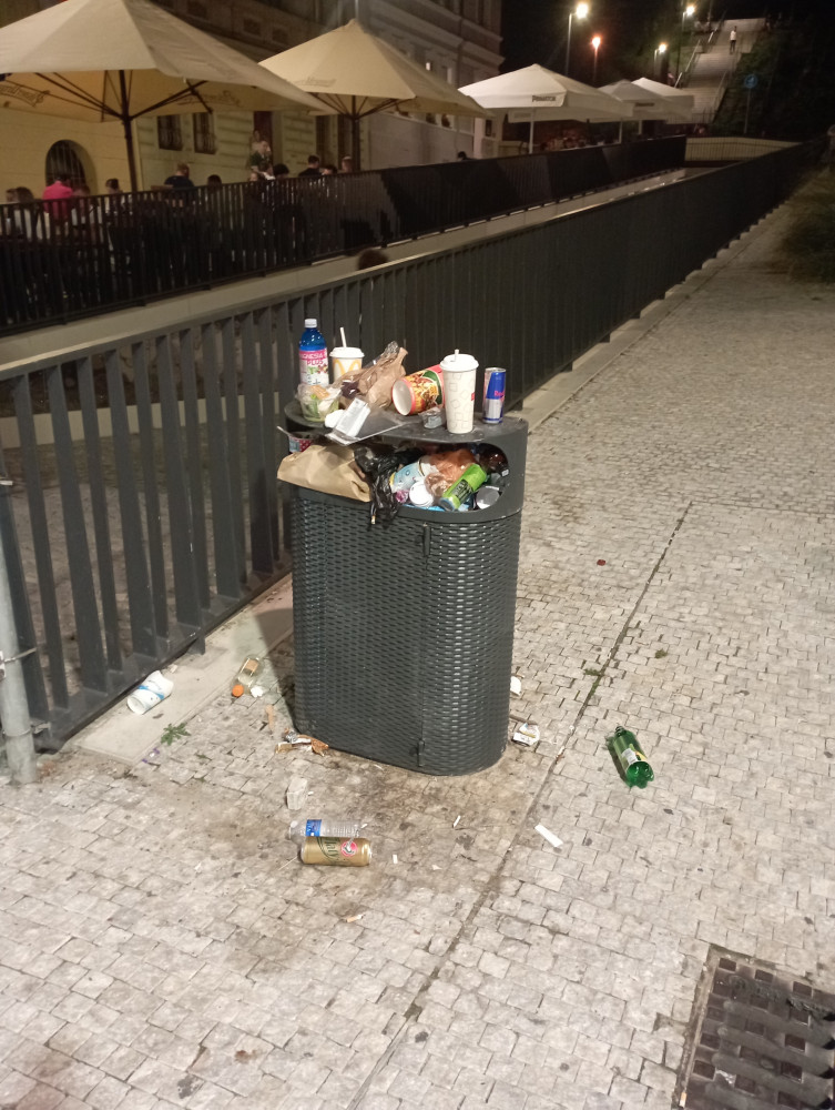 děkujeme za Váš podnět. Tato plocha by měla být pravidelně uklízena každý den pracovníky Pražských služeb. Prověřovali jsme, že by sem měli dorazit dnes do 13:00 a v rámci pravidelného úklidu by měli vše odstranit. Následně sami provedeme kontrolu, zda se tak skutečně stalo a případně místo doklidíme.