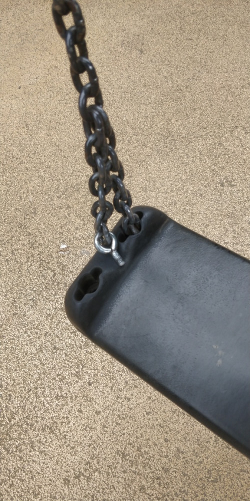 Poškozená houpačka pro děti. (Chybějící matka s podložkou)