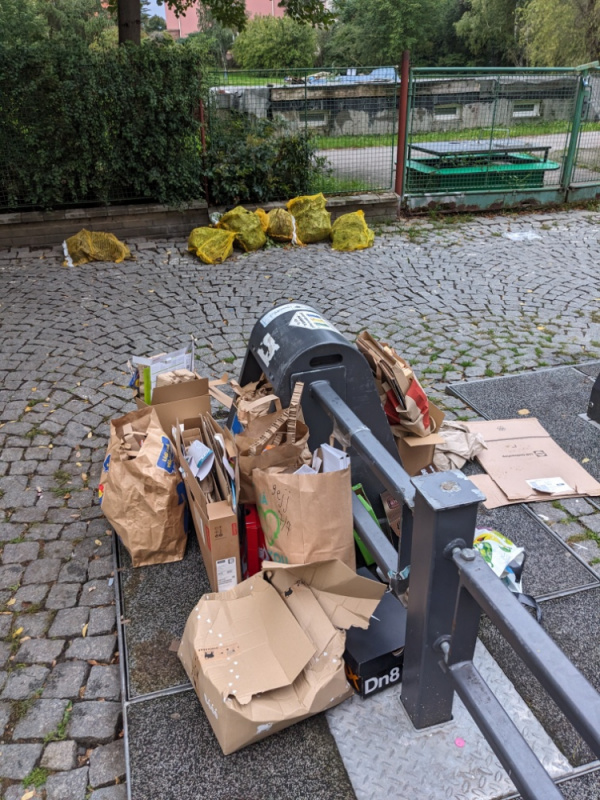 Dobrý den, děkujeme za Váš podnět. Tato plocha by měla být pravidelně uklízena každý den pracovníky svozové služby. V rámci pravidelného úklidu by měli vše odstranit. Následně sami provedeme kontrolu, zda se tak skutečně stalo a případně místo poklidíme. Krásný den Vaše Čistá Trojka