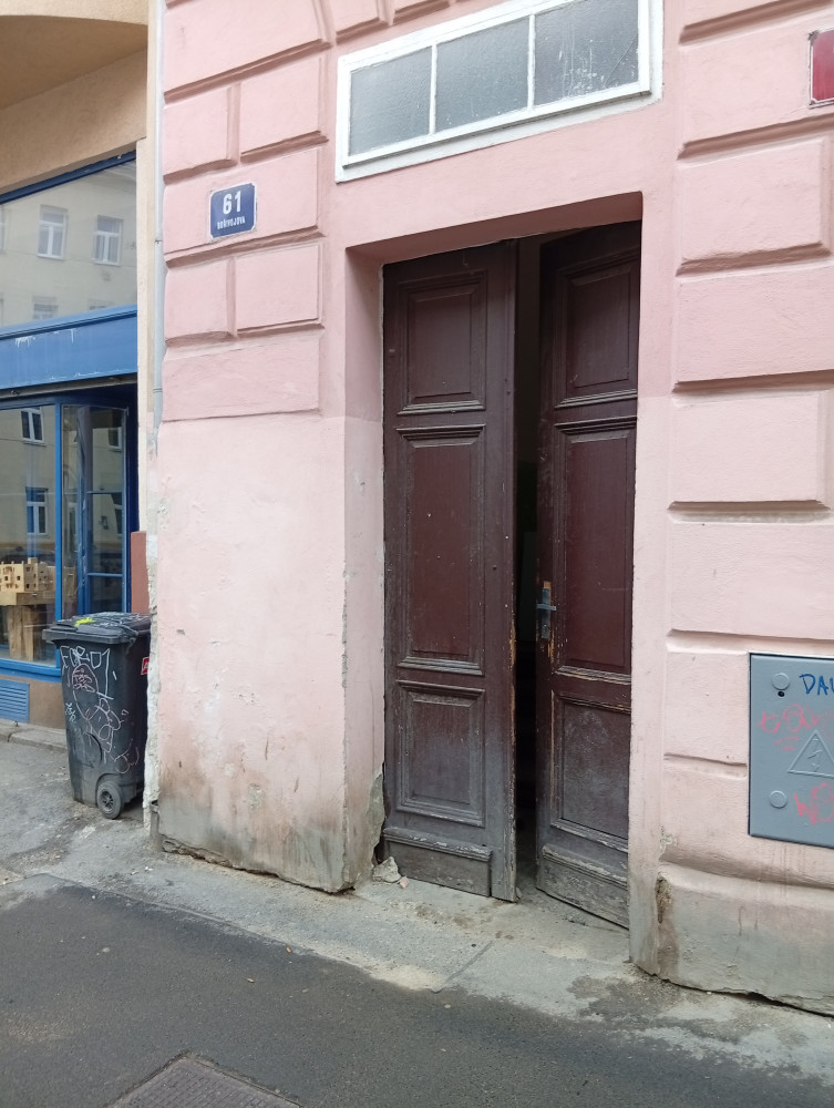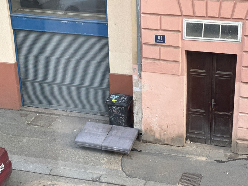 Sedací nábytek odložený u popelnic před domem Bořivojova 59, 61