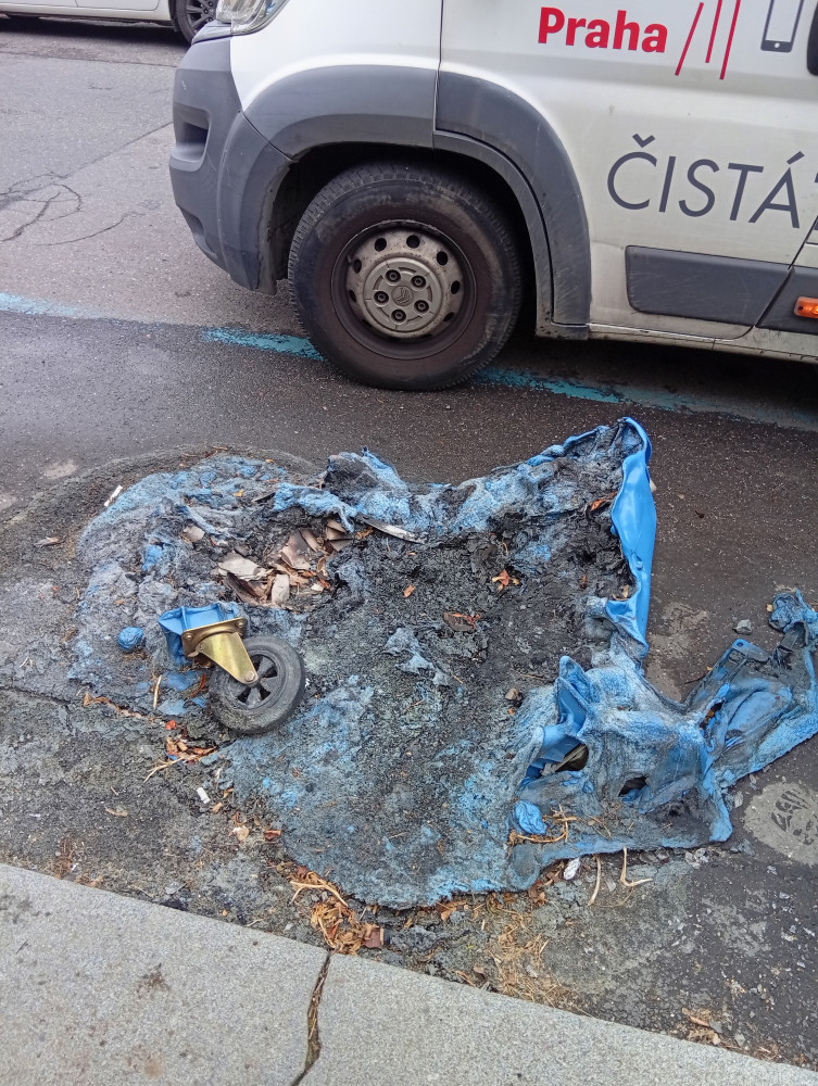 Už někdy před měsícem shořel kontejner s papírem v ul. V domově. Pražské služby to vyřešily novým kontejnerem, ale nikdo nezlikvidoval zbytky po tom starém, rozteklem na ulici. Je to o parkovací místo méně.