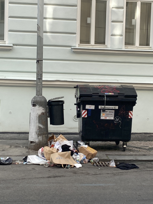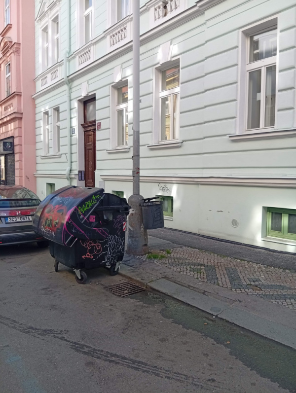 děkujeme za Váš podnět. O problému víme a MČ P3 ho již s majitelem řeší. Bohužel kontejner nelze zavážet do domu a má povoleno stání na chodníku. Nepořádek poklidíme hned jak to bude možné.