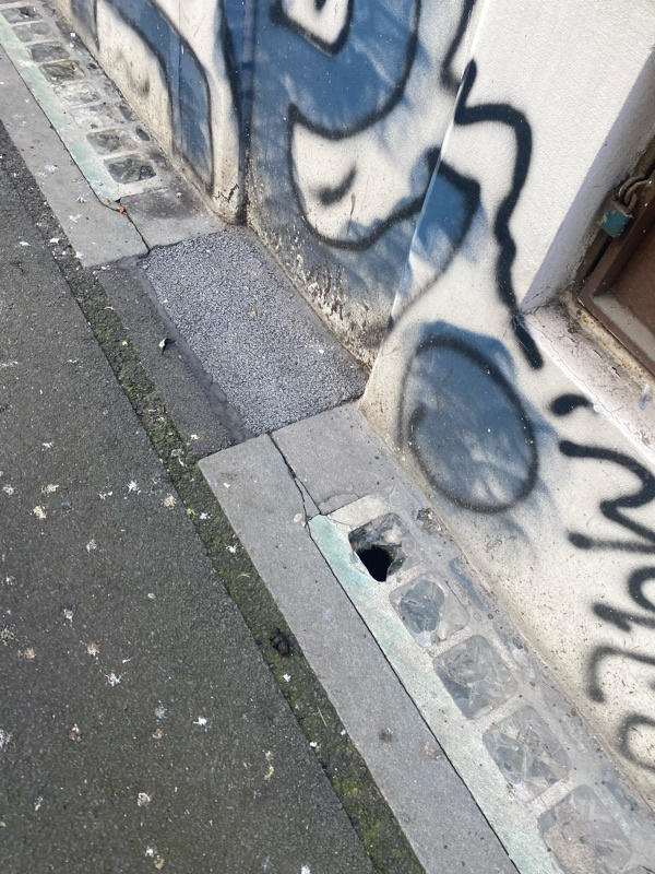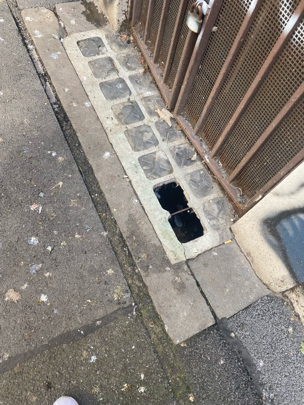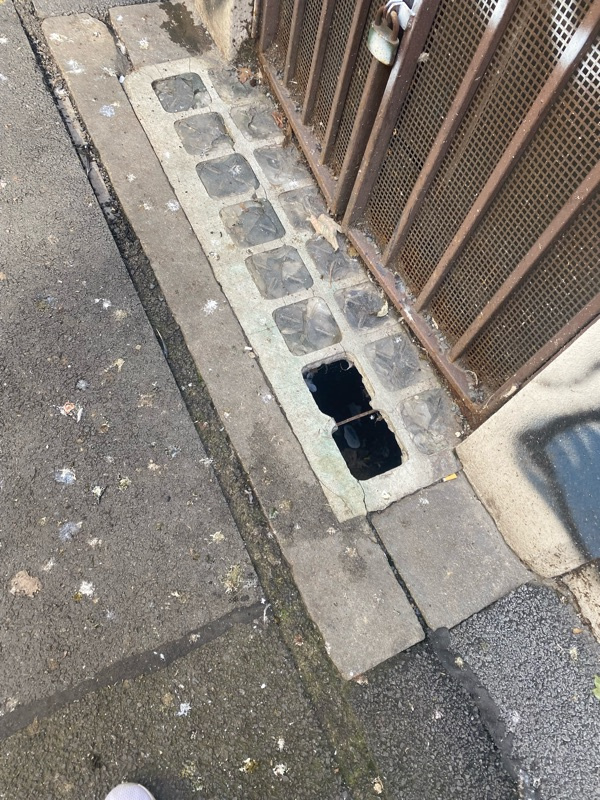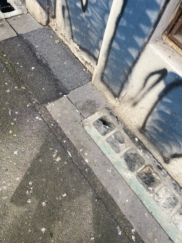 Díry ve skleněných dlaždicích. Veliké nebezpečí zapadnutí a pořezání dětské nohy či psí nohy. Již cca před rokem jsem žádala o nápravu, postoupili jste to a konečná informace byla, že to nařídíte vlastníkovi. Bohužel k nápravě nedošlo a úsek je velice nebezpečný.