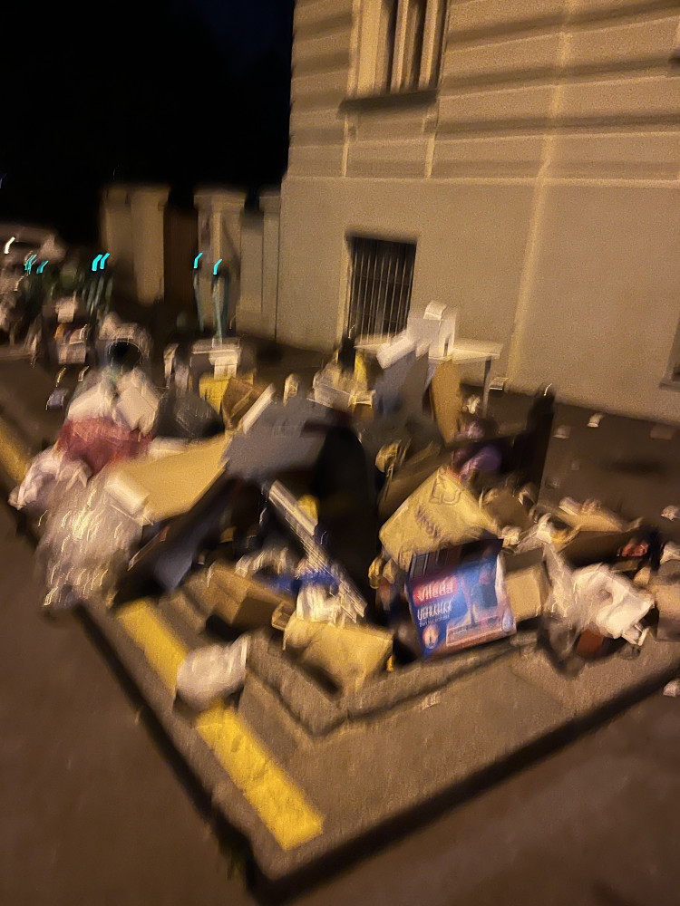 Volání o pomoc z Pribenicke ulice. Omlouvám se za špatnou kvalitu fotky, ale myslím že ta hromada odpadu všude kolem kontejnerů nejde přehlédnout ani rozmazaná