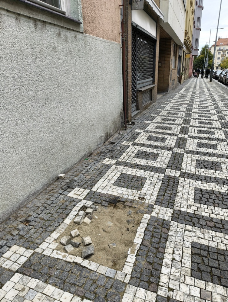 Uvolněná dlažba ve Slezské ulici mezi nám. J. z Lobkovic a Píseckou ulicí.
