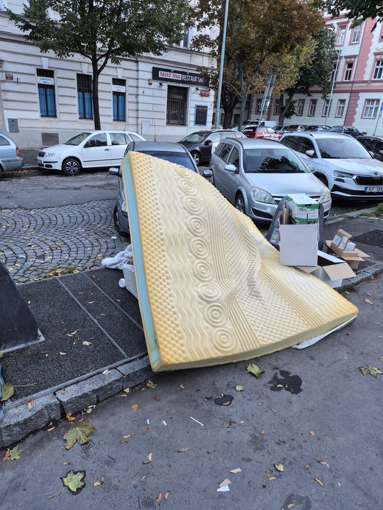 Nějaký idiot vyhodil molitanovou matraci u podzemních kontejnerů na tříděný odpad na nám. barikád :(