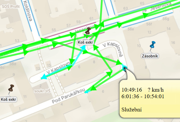 Ano, záznam je z vozidla, je tam zastávka a do vnitrobloku chodí pěšky. Výše je fotografie z pátečního vysypání koše a doplnění sáčků.