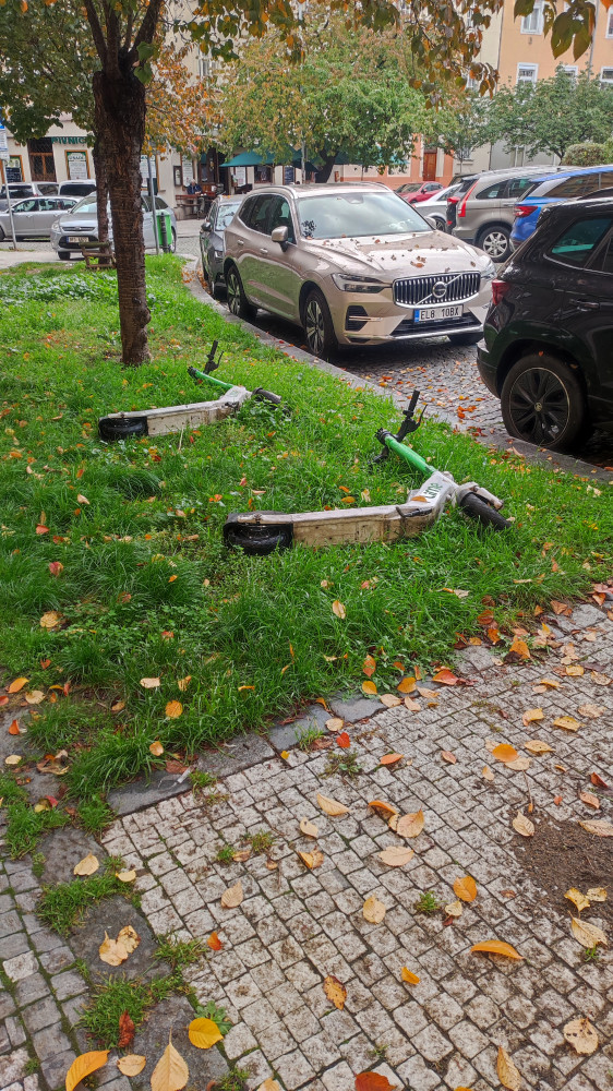 Koloběžky v trávníku mimo jejich parkovací mista, Škroupovo nám. 4