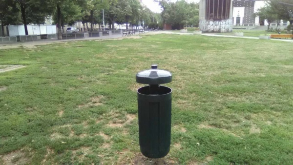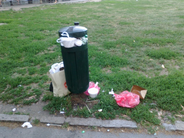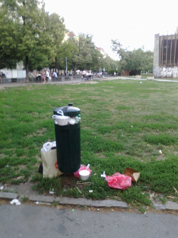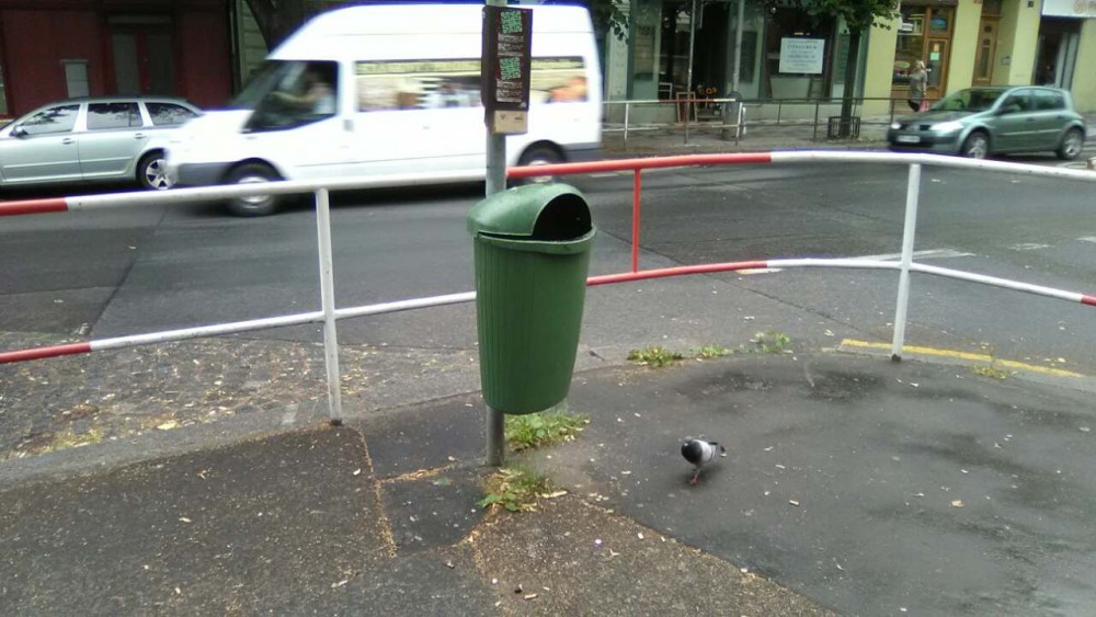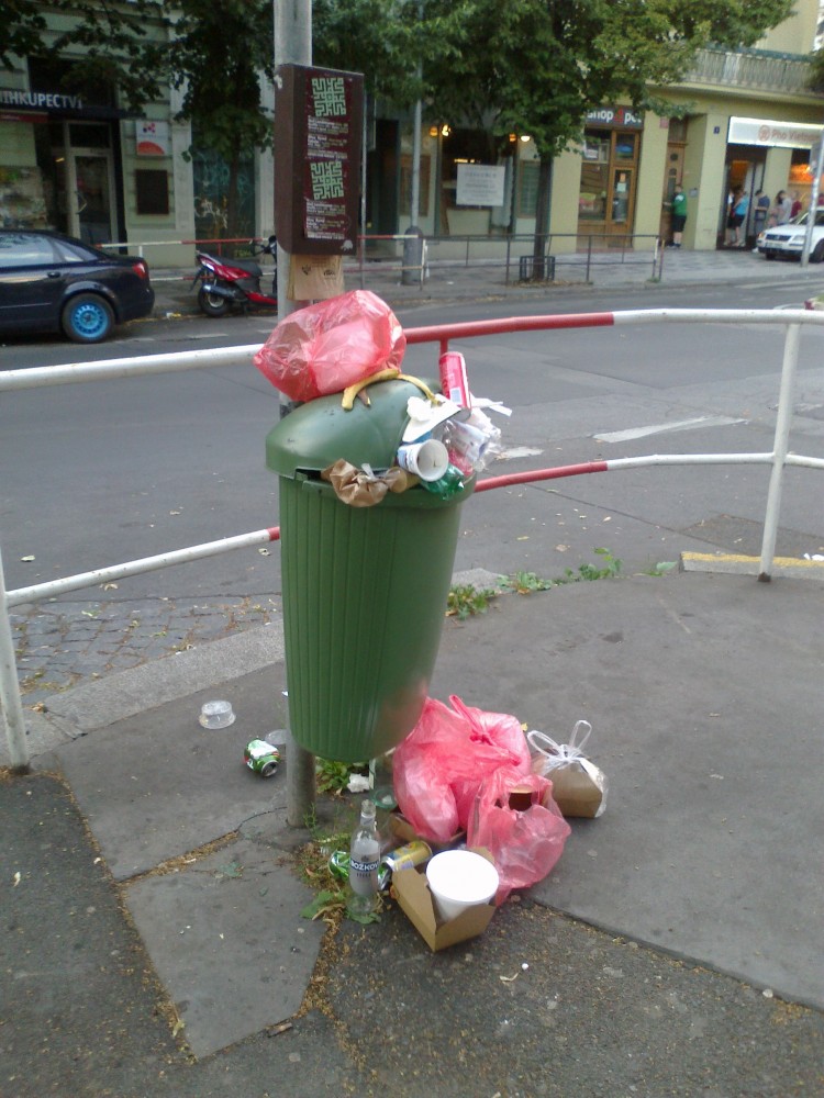 Odpadky navíc a "psí" odpadkový koš; nám. Jiřího z Poděbrad, neděle, kolem 19.30.
