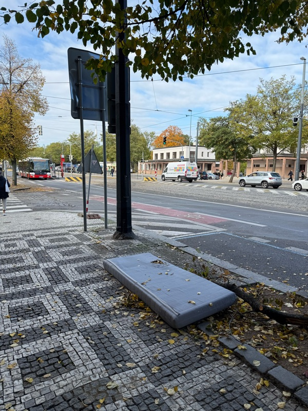 Odchozená matrace (již nejméně 3 dny) na rohu nám. Jiřího z Lobkovic a Vinohradské ulice (viz foto).