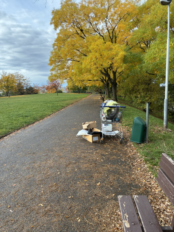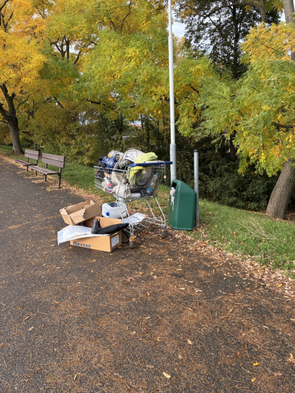 V parku židovské pece, kolem centrální části parku je odtrhnutý koš a nákupní vozík se smetím kolem.