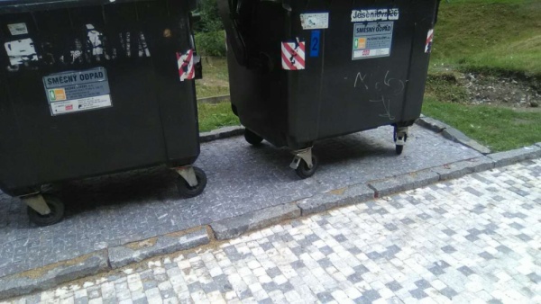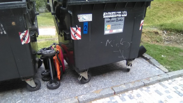 Kočárek a nepořádek okolo kontejnerů.