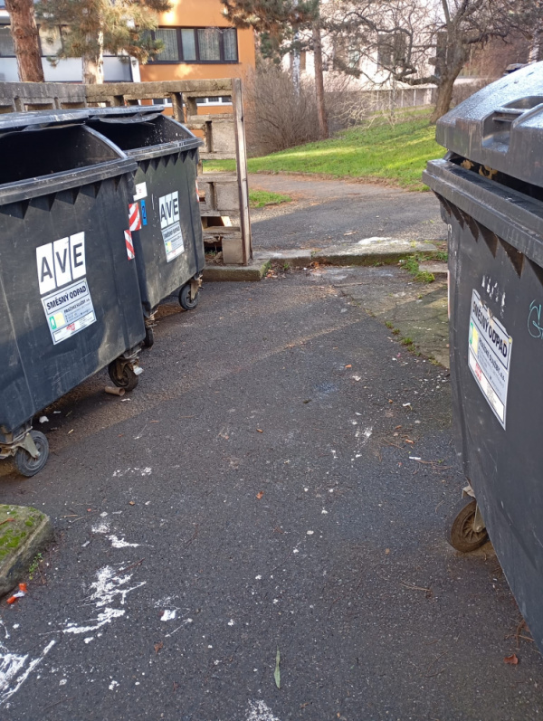 Bordel kolem popelnic ktery zasahuje az na chodnik jedna se o pravidelny jev a bylo by treba jej resit vice nez jenom uklidem