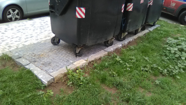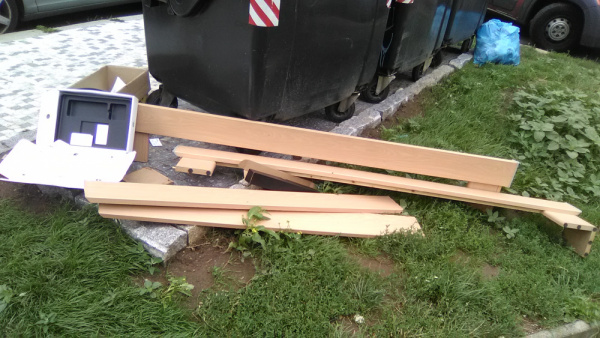 Rozložená postel a odpadky v okolí kontejnerů.