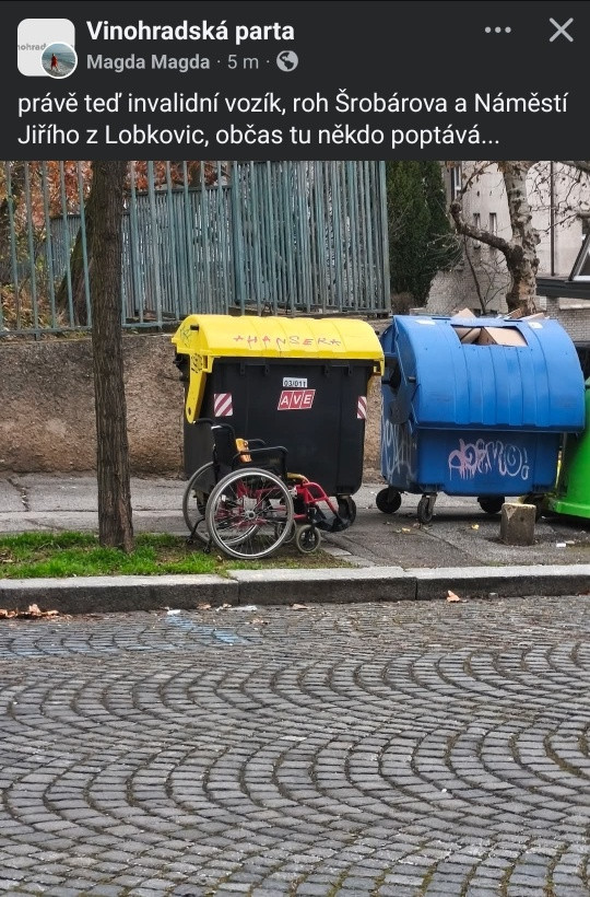 Invalidni vozik odlozeny u kontejneru - Podnet predavam z facebooku, protoze mi prijde skoda, aby vozik u kontajneru byl znecisten nebonpodkehal pivetrnostnim vlivum. Prosim o jeho odvoz a predani instituci, ktera pro nej najde dalsi vyuziti.
