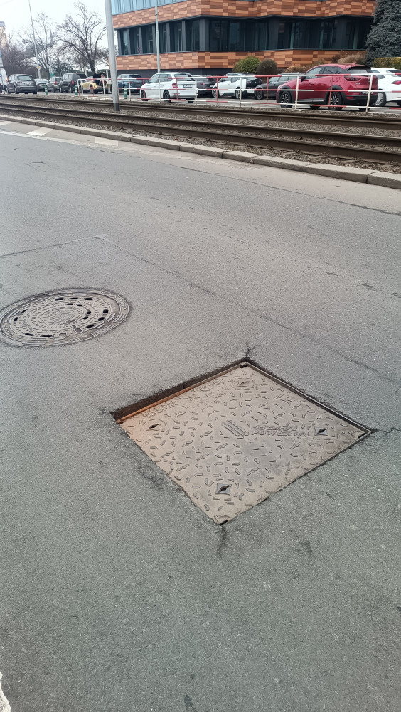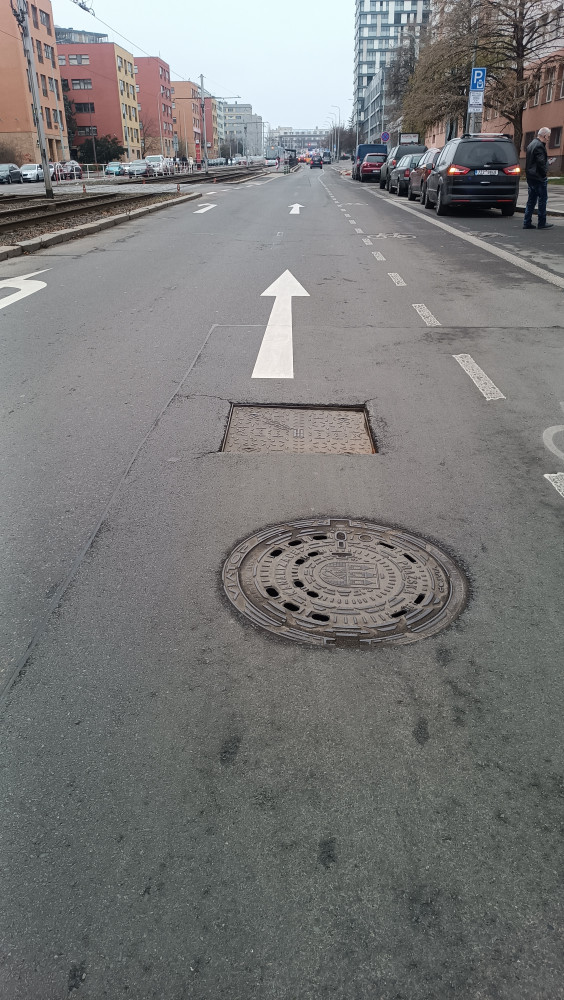 Propadlý kanál na silnici. Ve směru na Jana Želivského.