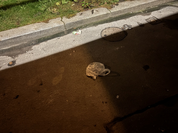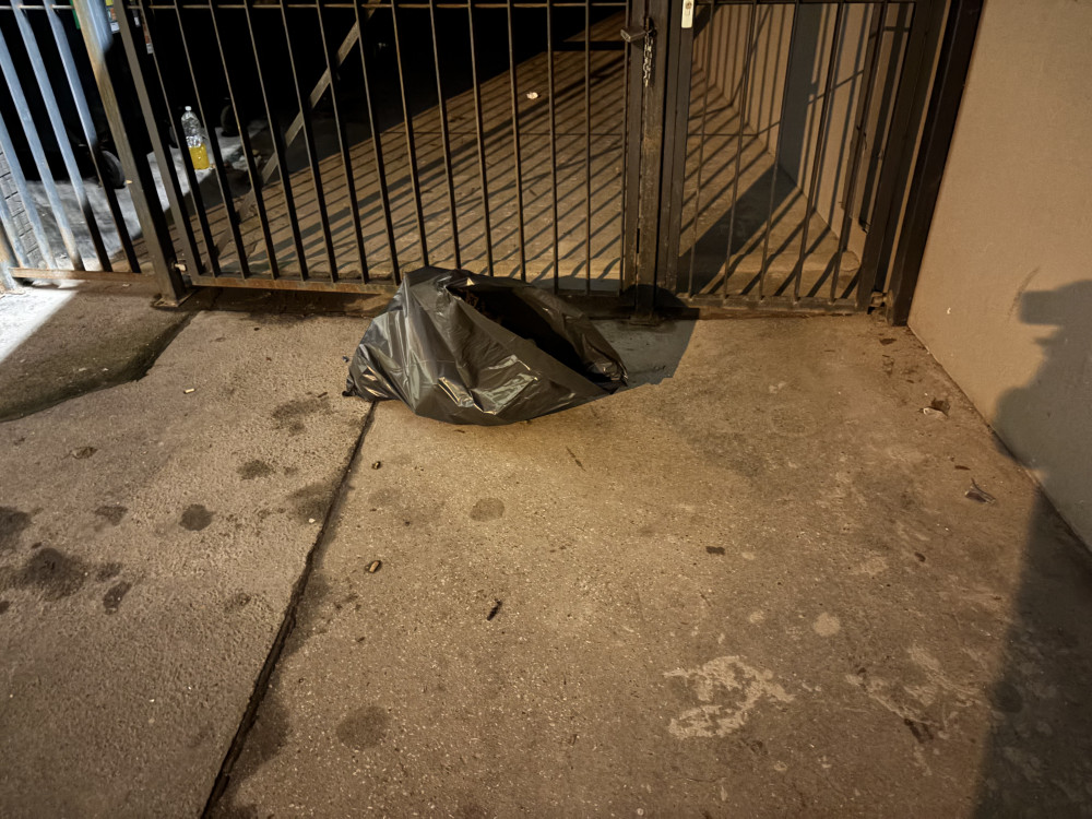 Odpadky na veřejném chodníku a trávníku Roháčova ulice 42