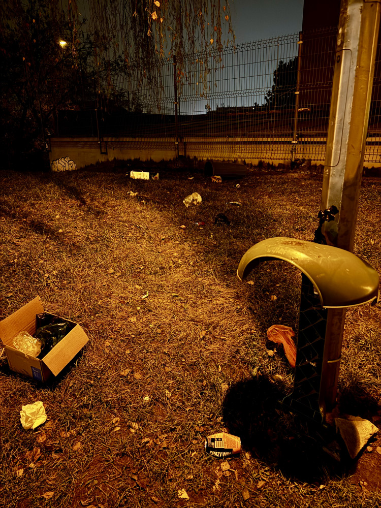 Chybějící sáčky a poškozené koše na psí exkrementy. U domů Pod Lipami 2662/1 a 2662/7.