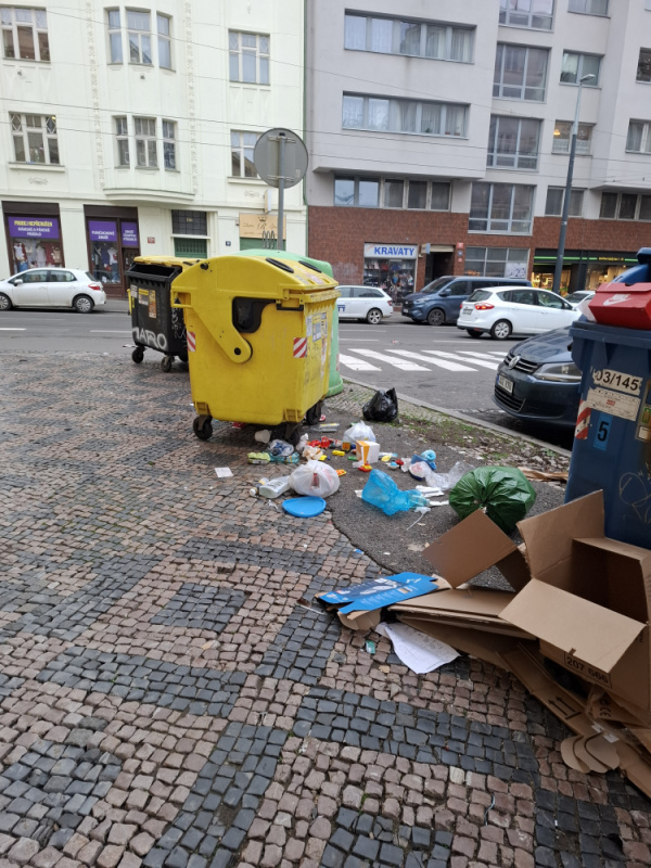 děkujeme za Váš podnět. Úklid jednotlivých stanovišť kontejnerů na tříděný odpad probíhá pravidelně podle stanoveného harmonogramu (od 6:00 do do 22:00 každý den včetně sobot a nedělí). Provedeme kontrolu a případně předáme podnět společnosti AVE CZ, která kontejnery na tříděný odpad vyváží a za pořádek kolem nich odpovídá.