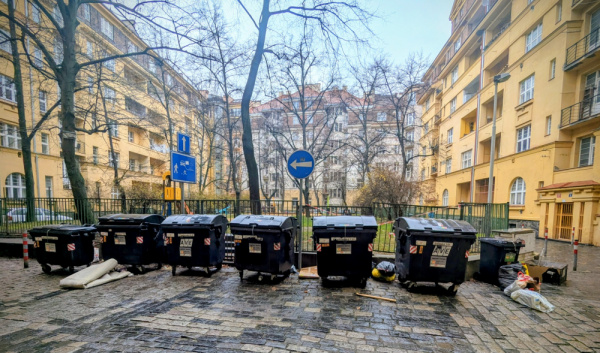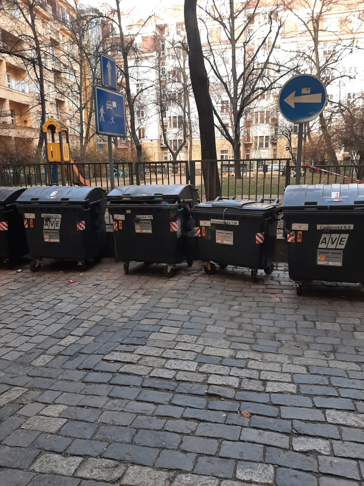 Ve vnitrobloku, který je otevřen z obou ulic, je neustále nepořádek kolem popelnic.