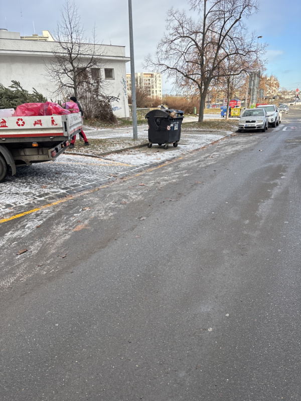 Ulice vypadá jako skládka. Kontejnery jsou přeplněné a okolo se vrší odpadky, další odpadky se válí po okolí.