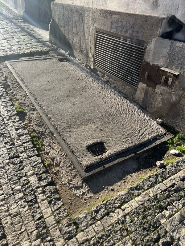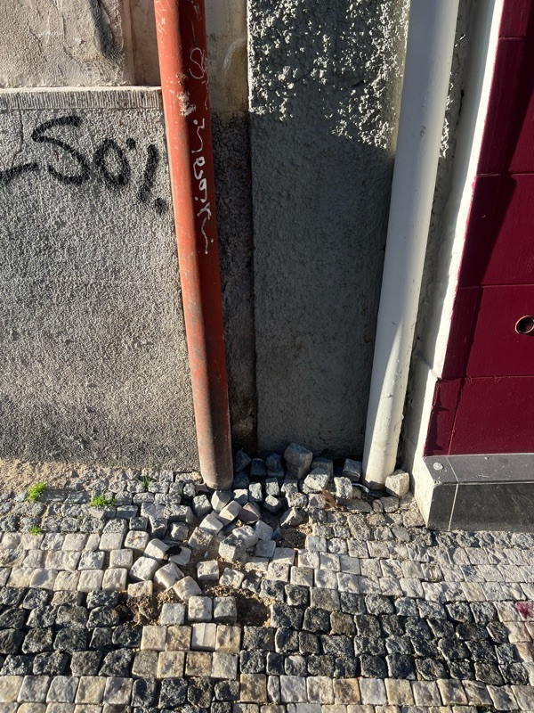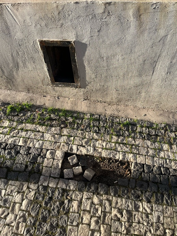 3 díry v chodníku,, vysypané kostky a vymletá díra okolo poklopu, vše u jednoho domu