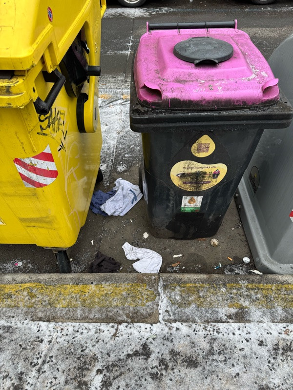 Prosime o uklid okolo kontejneru (sklo, hadry, odpadky) a prilehleho okoli (pytel) - viz foto. Dekujeme