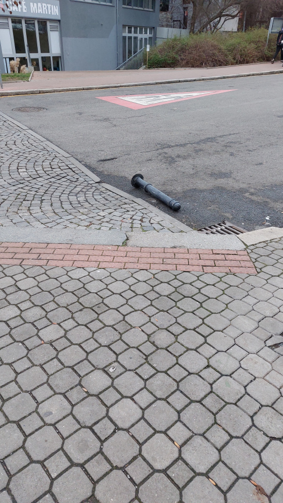 Jeden sloupek ohnutý, druhý úplně vylomený.