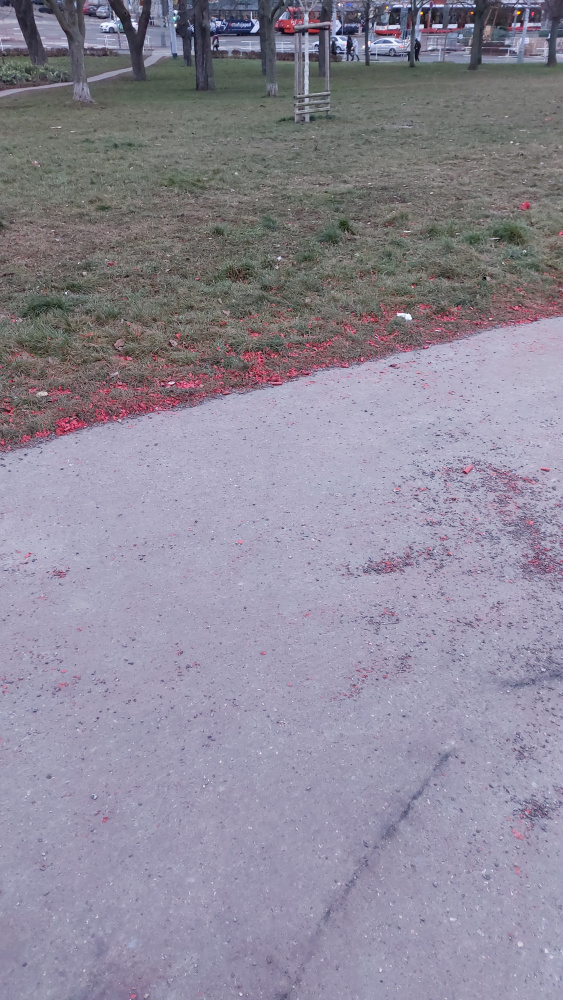 V parčíku u ZŠ Chelčického je spousta nepořádku po rachejtlích. Hlavně u chodníku u výjezdu RZS