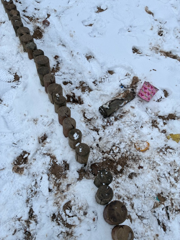 Vylomené dřevo u pískoviště na malém hřišti.