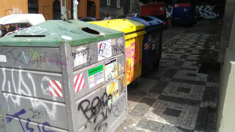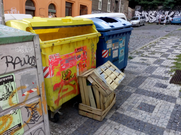 Dřevěné lísky před kontejnery Jeronýmova, Husitská, patrně z protějšího obchodu. Žlutý kontejner nejde zavřít, modrý má odtržené víko.