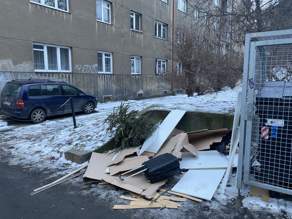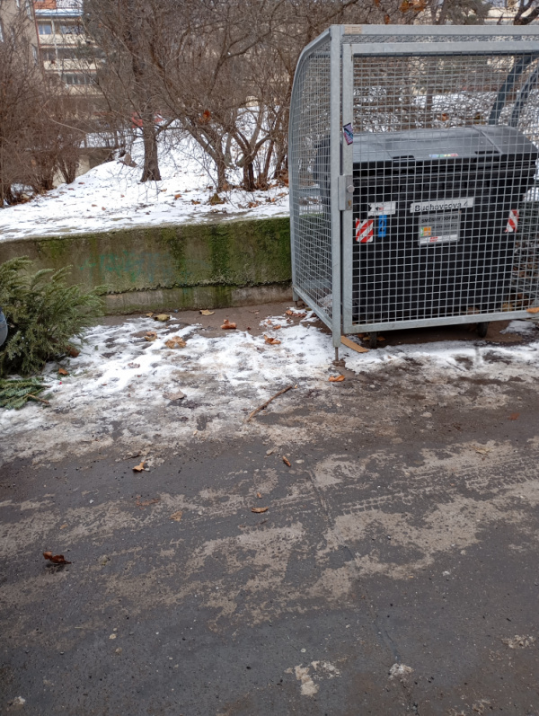 Dobrý den. Neustálí nepořádek vedle popelnic v uzamčeních klecí. Zakládaní černé skládky.