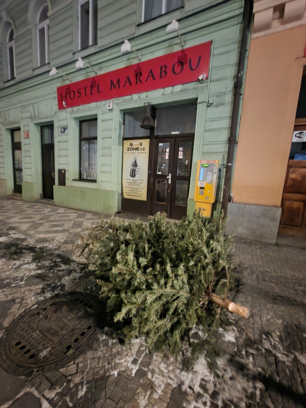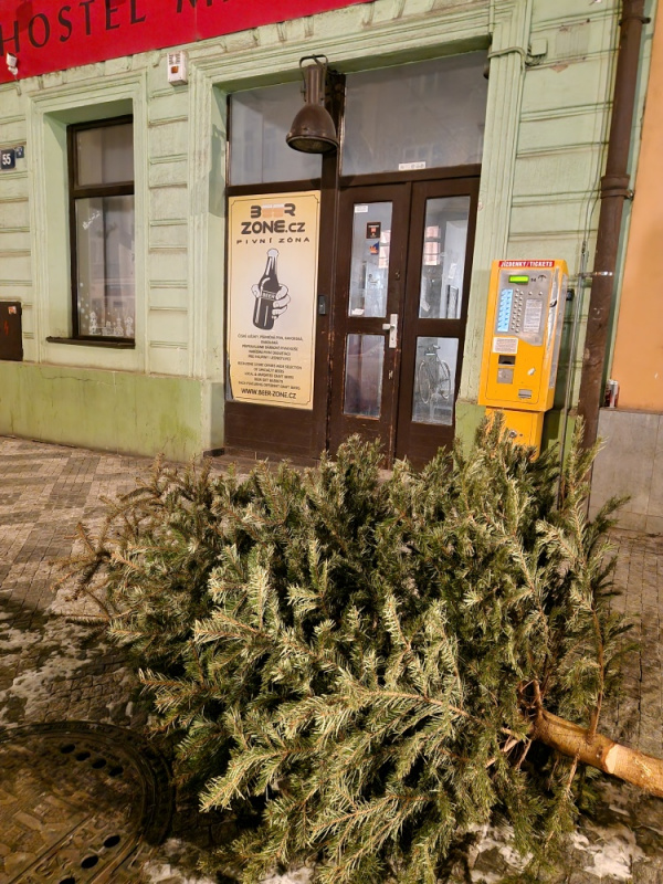 Vyhozený vánoční stromek před ubytovnou Marabou, Hartigova 55. Možná je dohoda o úklidu, nevím, ale je uprostřed chodníka, nedaleko autobusové zastávky Černínová.