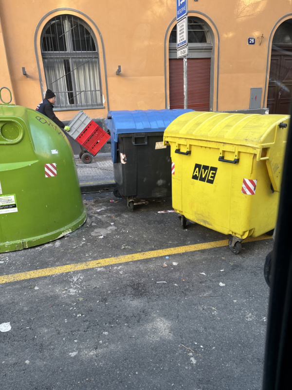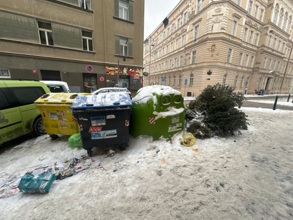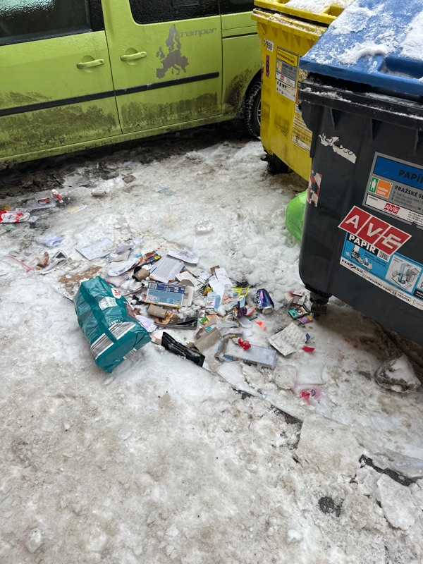Hezky den, na Vlkova 26 je opet neskutecny neporadek kolem popelnix. Nejen stromky, ale i dalsi smeti.