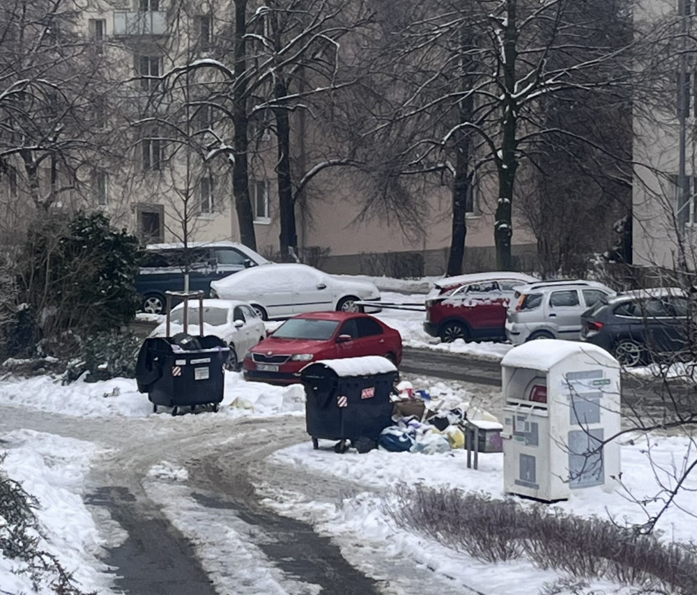 Nepořádek okolo kontejnerů.