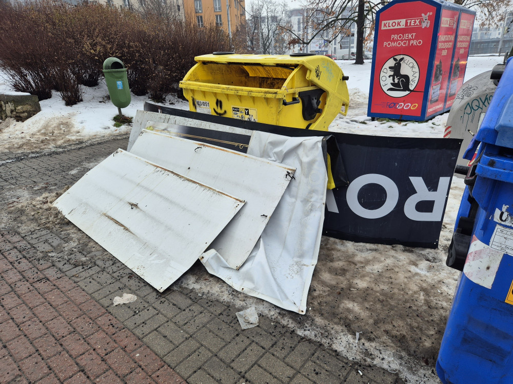 Velké kusy nepořádku blokují přístup ke kontejneru.