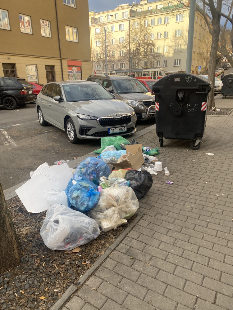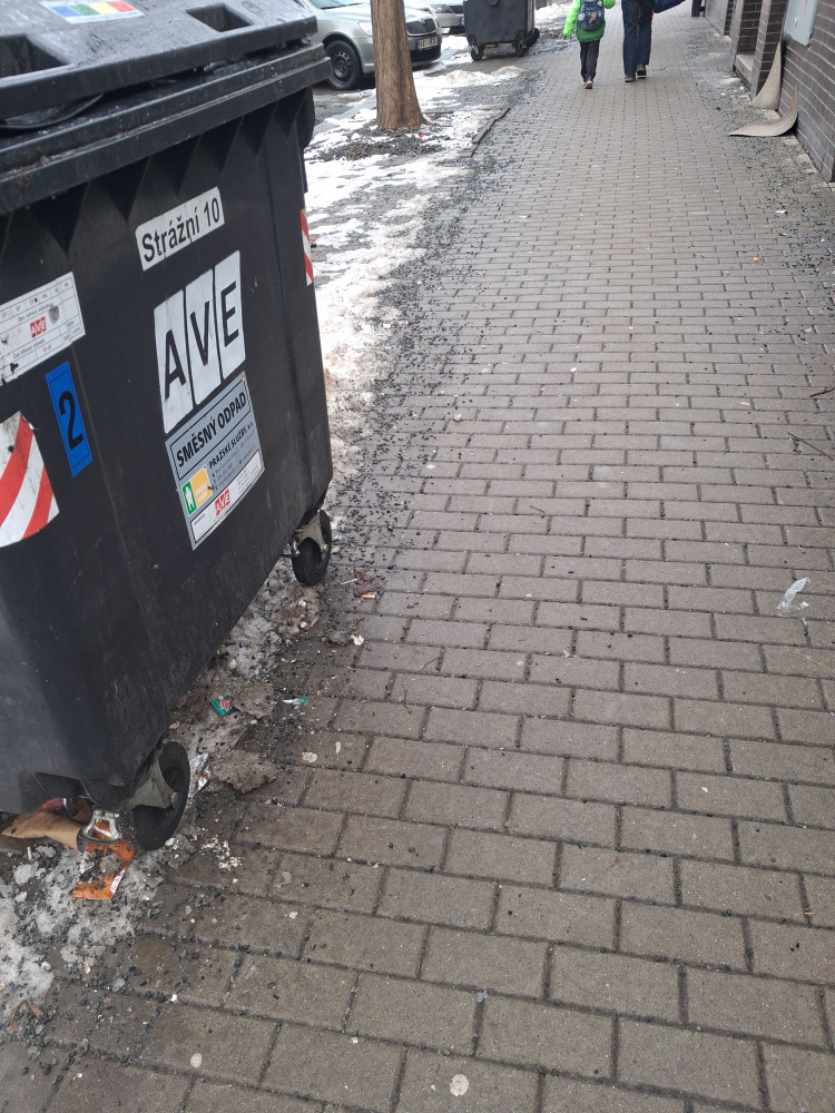 Po odvozu komunálního odpadu zůstávají rozházené odpadky kolem kontejneru - stále stejné místo, stále stejní lidé, týden co týden.