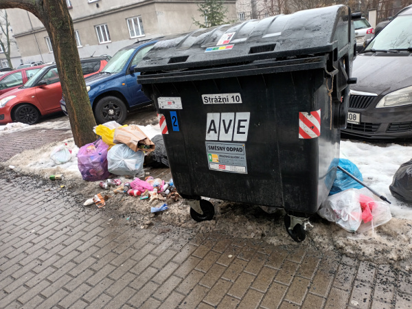 Po odvozu komunálního odpadu zůstávají rozházené odpadky kolem kontejneru - stále stejné místo, stále stejní lidé, týden co týden.