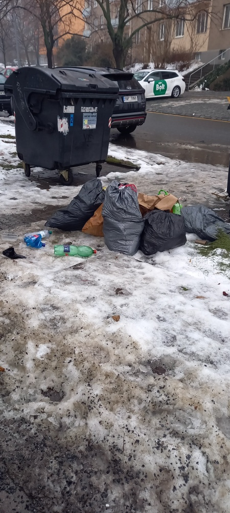prosím o úklid nepořádku kolem popelnic u Pod Lipami 76