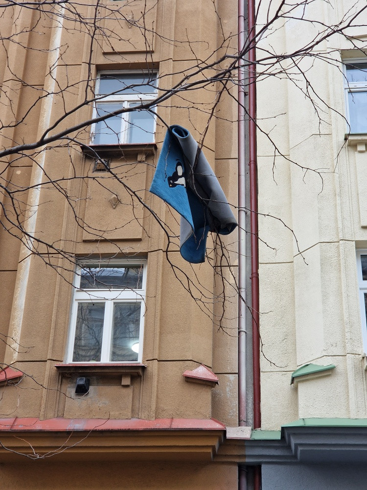 Koberec zachytený na strome nad parkovacími miestami pred adresou Zelenky-Hajského 14.