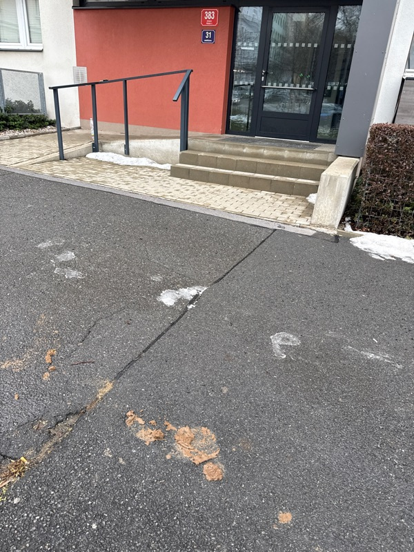 Evkrementy na chodníku u domu 31. Nahlasene, neuklizené a již rozšlapane.