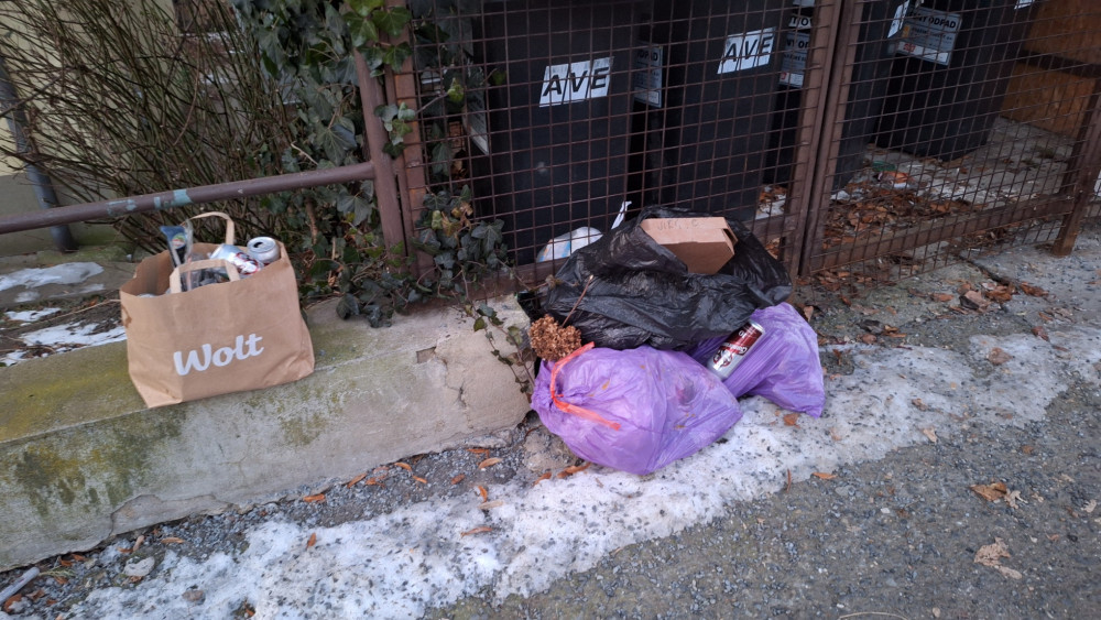 Odpad pred sukromnymi popelnicami. Prednedavnom sa nam tento problem zacal opakovat, bohuzial fotopast vinnikov nezachytila!